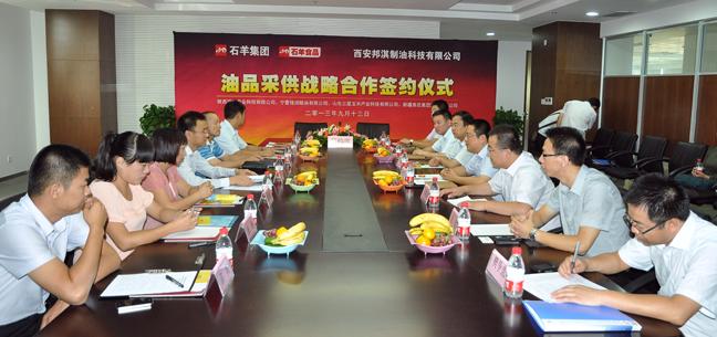 9月13日的石羊集團總部,秋高氣爽、陽光燦爛,9點30分,經過行政部與市場部前期的緊張籌備,油脂事業部與陜西建興農業科技有限公司、寧夏鋒潤糧油有限公司、山東三星玉米科技有限公司及新疆泰昆集團股份有限公司四家油企“油品采供戰略合作簽約儀式”在三樓會議室如期舉行。