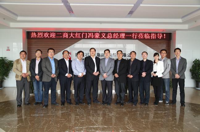 4月4日12時北京二商集團大紅門肉類食品有限公司總經理馮豪義、蒲城大紅門公司總經理薛克來等一行五人蒞臨石羊集團總部參觀交流,集團總裁常青山、副總裁韓春元、油脂事業部總經理孔紅民等有關領導接見會談。