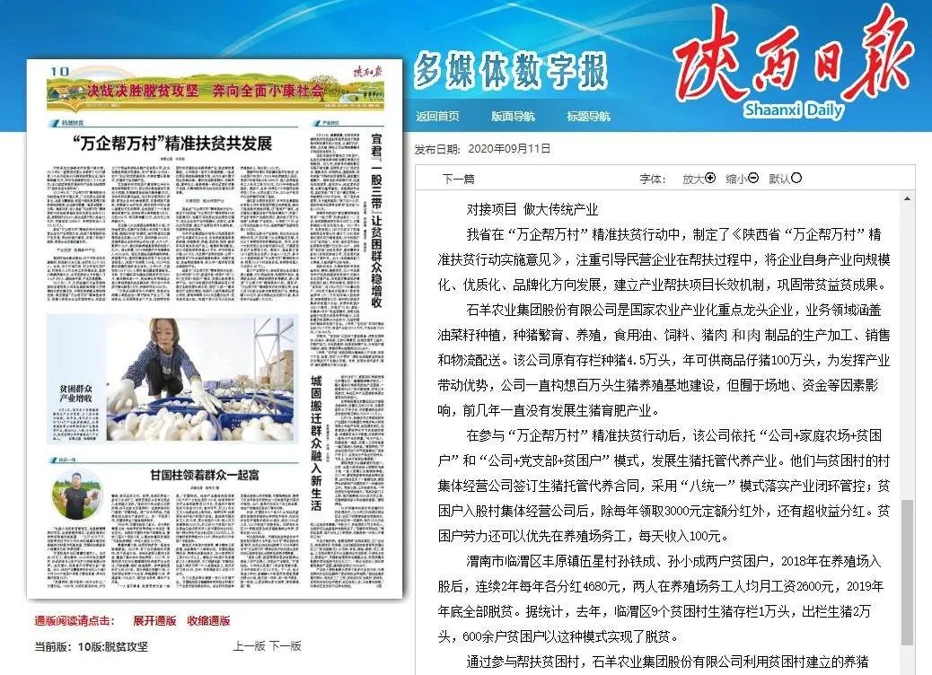 9月11日,陜西日報刊登題為《“萬企幫萬村”精準扶貧共發展》報道。