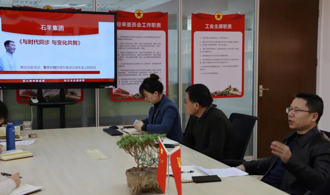 集團工會主席、財務總監段鵬博帶領全體參會人員認真學習貫徹集團黨委書記、董事長魏存成在集團總部年會上《與時代同步 與變化共舞》的重要講話,落實魏總對全體石羊人要做到學習、自律和信任的三個要求。石羊人要有歸零心態,樹立標桿,對標自己,提升自己,今后就是學習者淘汰不學習者,創新者淘汰不創新者的時代。