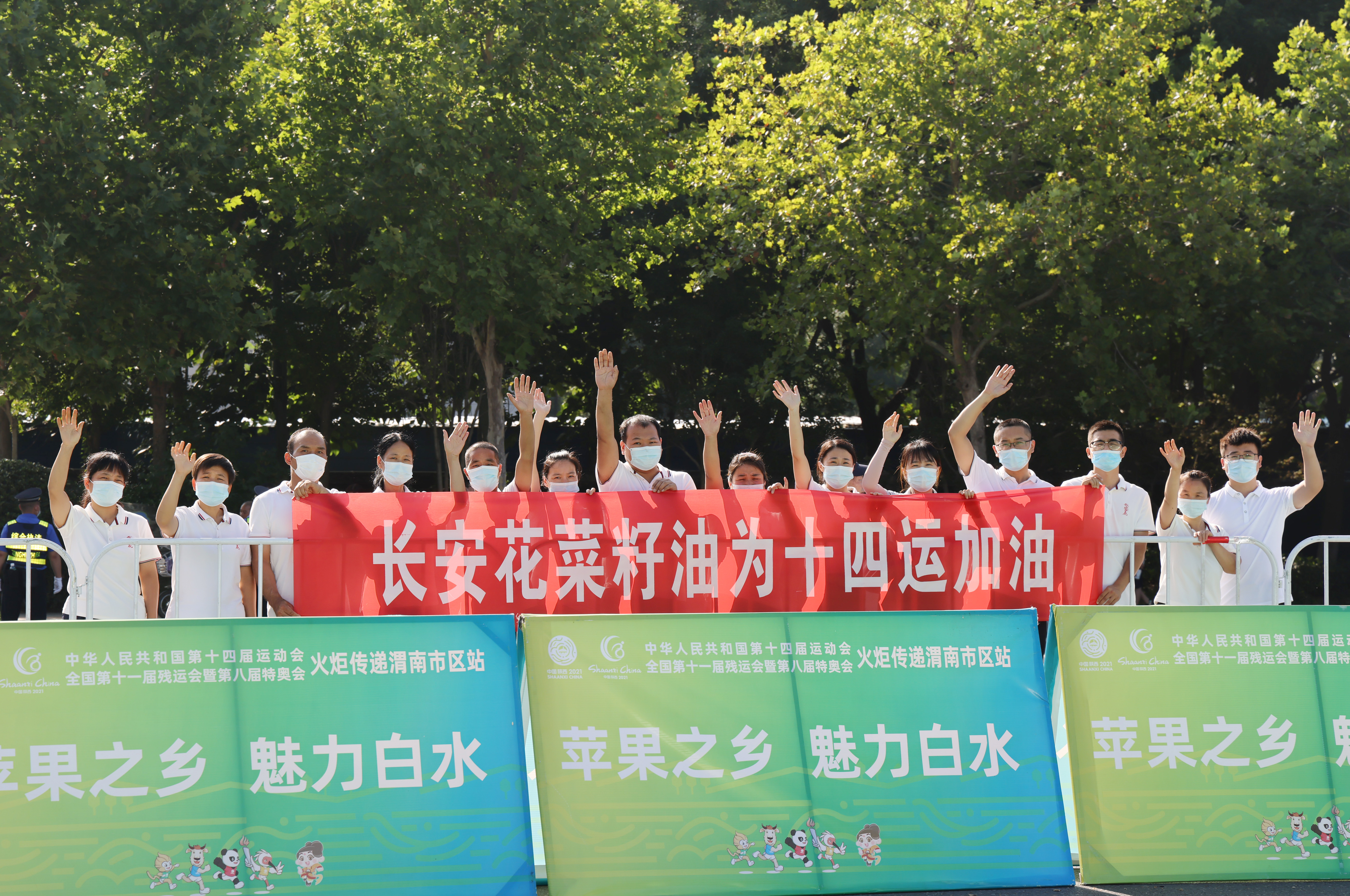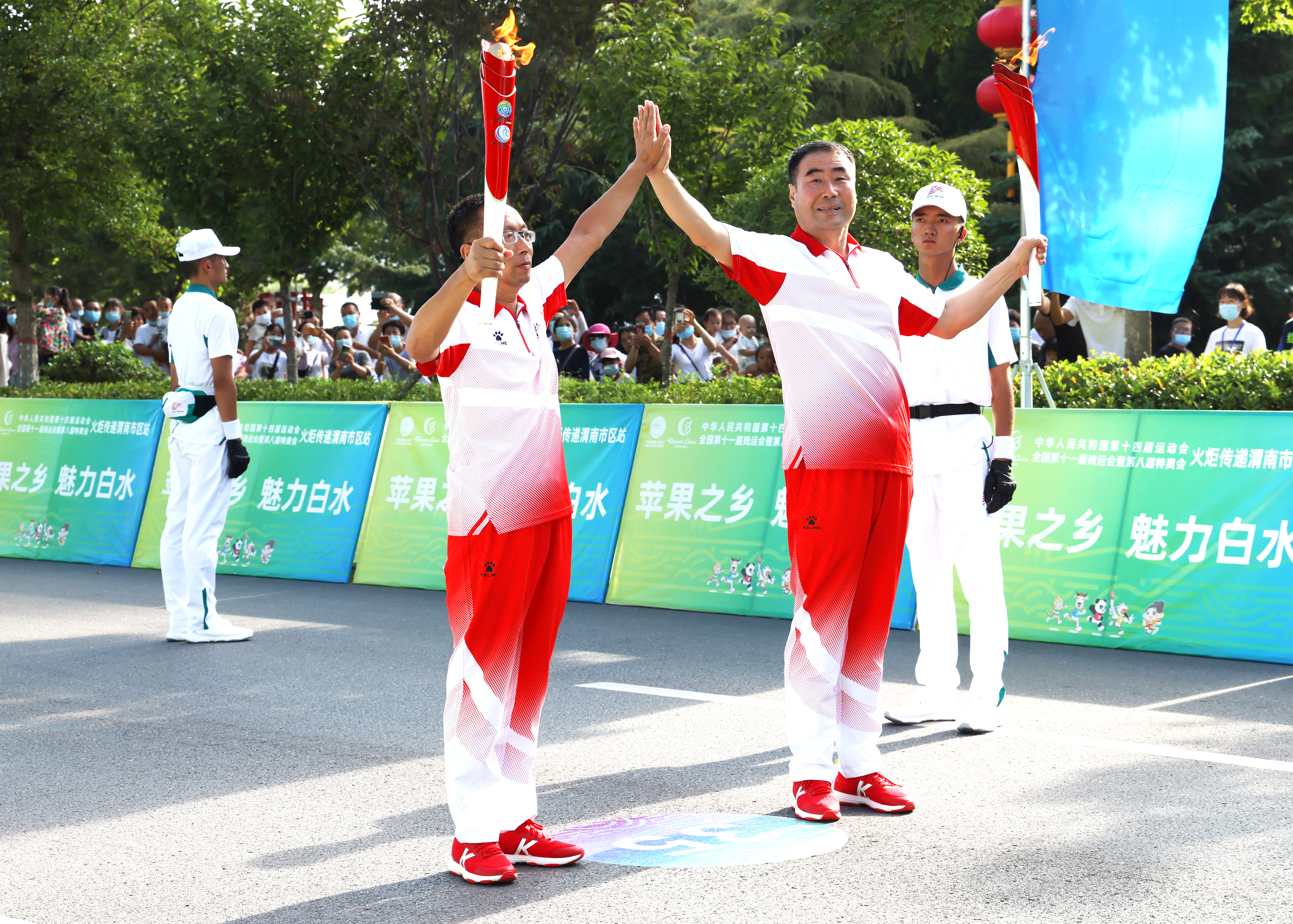 采集自革命圣地延安的圣火,歷經西安首站傳遞,今天在渭南熊熊燃燒。延安精神與渭華起義精神交相輝映,體育文化在這里煥發出新的光彩。69名火炬手滿懷熱情,高舉象征希望的圣火,穿過秦東大地,唱響“全民全運、同心同行”的主題,展示渭南人民勇立潮頭、爭當時代弄潮兒的志向和氣魄。火炬傳遞路線兩旁站滿了市民群眾,大家都不時把陣陣掌聲與祝福送給十四運會和殘特奧會,祝福十四運會和殘特奧會精彩、圓滿。